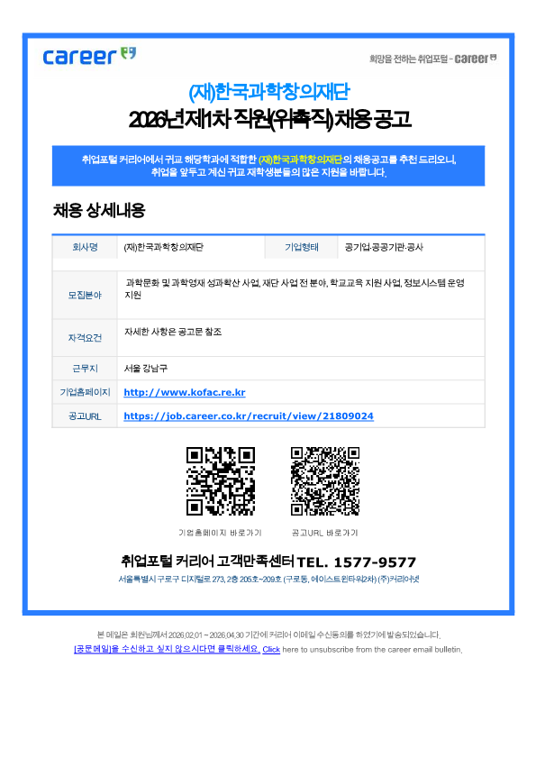2026년 제1차 한국과학창의재단 직원(위촉직) 채용 공고 (~4/8(수))